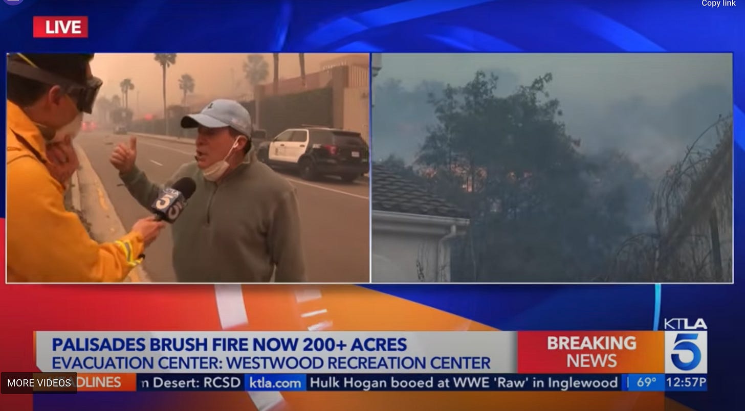 It’s Steve Guttenberg, who was just interviewed as a “citizen” who was helping people evacuate. Even though there’s an imminent disaster, the ticker crawl has a headline about one of my least favorite people, Hulk Hogan, getting booed by LA this past Monday, which feels approximately six months ago.